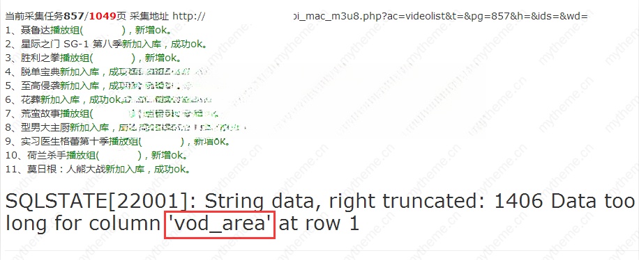 • 一般报错基本是语言(vod_lang)和地域(vod_area)两个字段采集的数据超过了数据表字段的类型长度限制