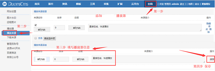 需要先再网站后台添加对应的播放器,才可以实现播放。下载文件解压后按下图操作【下载播放器文件】