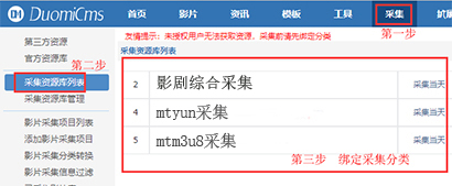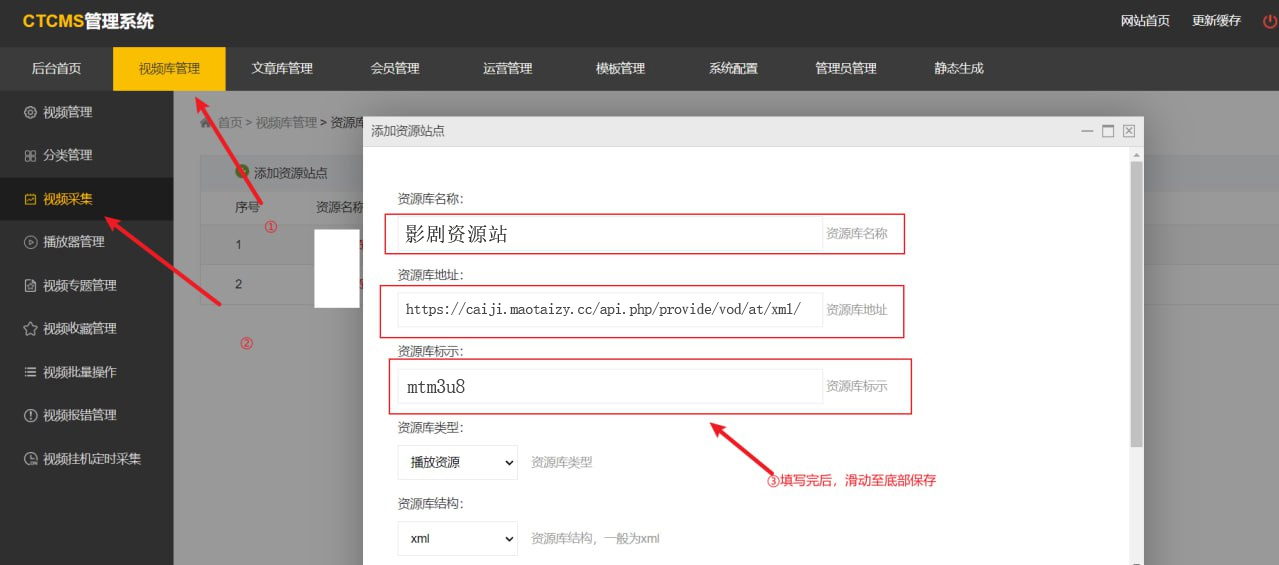 请按以下步骤进行:依次点击【采集】-【采集资源库管理】,然后依次输入